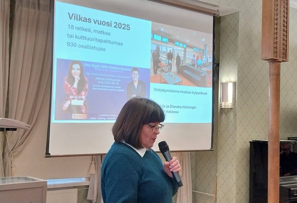 • Merja ja Antero kertoivat viime vuoden retkistä, matkoista ja teatterikäynneistä, väkeä oli saatu runsaasti tapahtumiin. Katsaus myös tämän vuoden konserttitapahtumiin ja teatterinäytöksiin. Tulossa myös jokeri-ja kulttuurimatkoja ehkä kylpyläänkin.